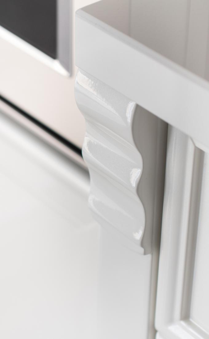 Con la sua finitura 100 gloss riflette la luce offrendo così uno spazio percepito più ampio della realtà. I dettagli di pilastri e cornici rendono sinuose e morbide l'armonia tra varie stanze
