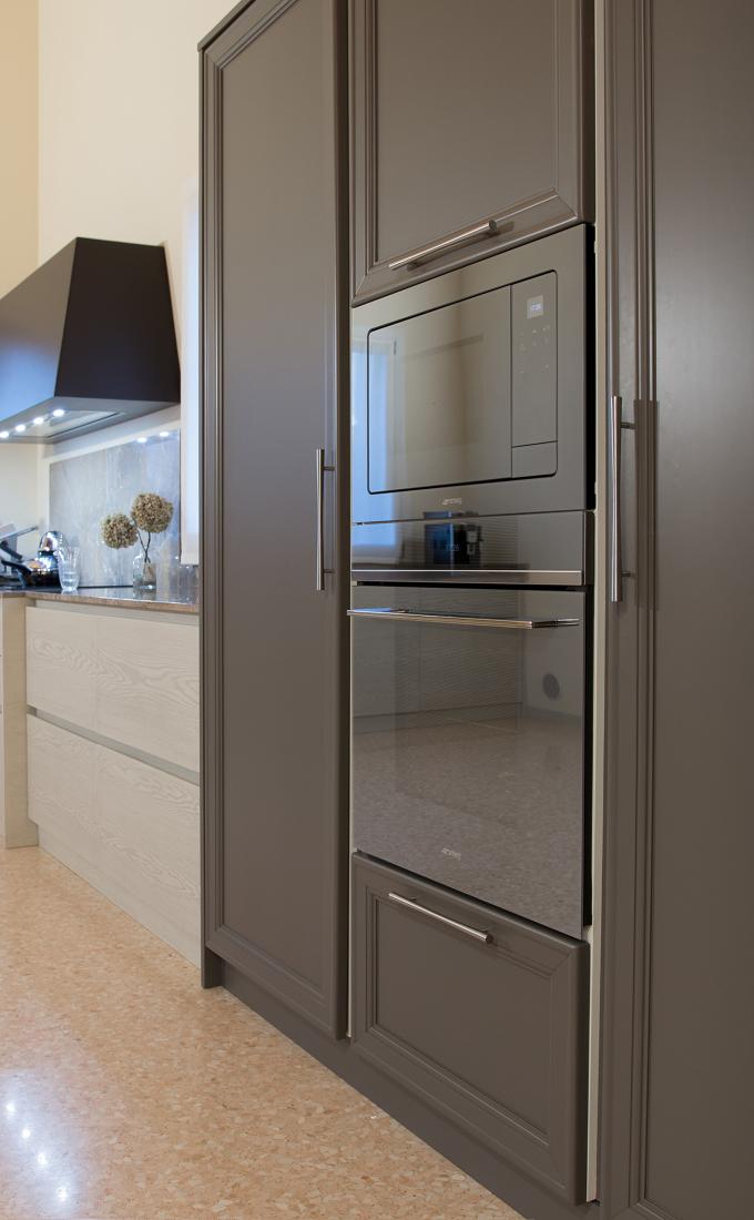 Una cucina che unisce vari stili pensata con strutture personalizzate e sistemi a misura per sfruttare e riorganizzare al meglio.